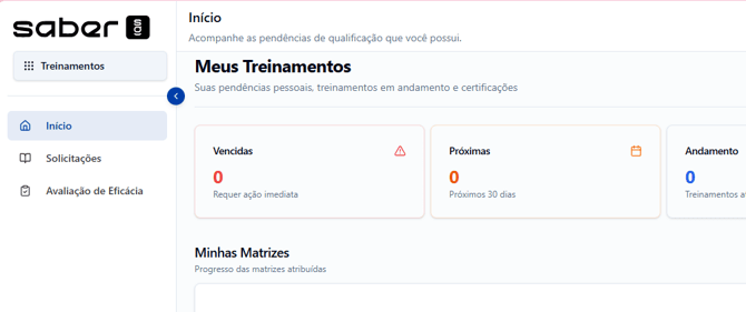 Ao acessar o módulo, a primeira aba exibida será “Início”. Nela, você encontrará suas pendências pessoais, os treinamentos em andamento e suas certificações.