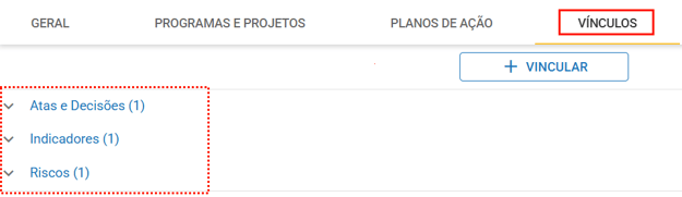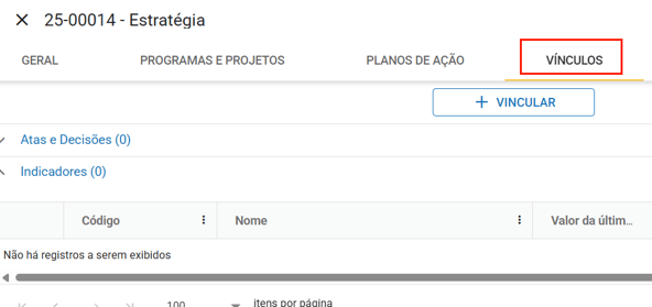 Ao criar ou editar uma estratégia, você pode vincular outros módulos a ela — como Indicadores, Riscos, entre outros. Essa funcionalidade permite que sua estratégia fique mais rica em informações e mais fácil de acompanhar, pois tudo que está relacionado aparece de forma integrada.