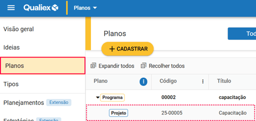 Para adicionar um anexo a uma ação, acesse a aba Planos e escolha o projeto em que deseja realizar essa ação.