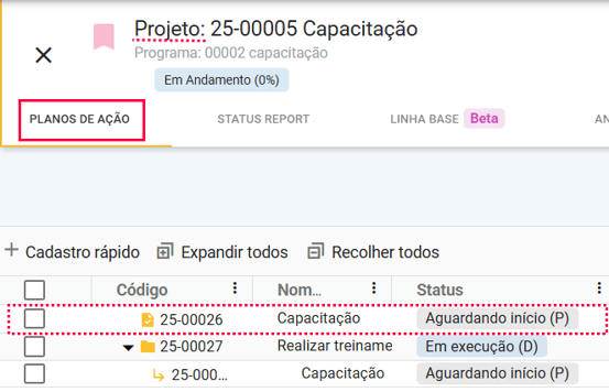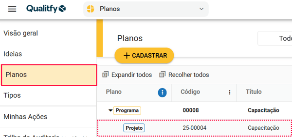 Para adicionar um anexo a uma ação, acesse a aba Planos e escolha o projeto em que deseja realizar essa ação.