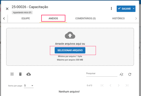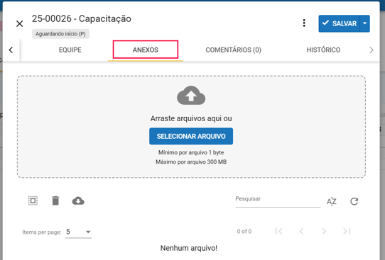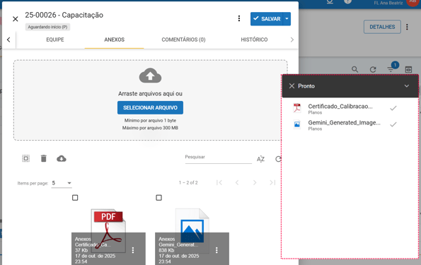 O sistema permite o envio simultâneo de vários arquivos como anexos. Para garantir que todos os arquivos sejam corretamente processados, é importante aguardar até que o carregamento de cada um seja concluído. Somente após esse processo os arquivos aparecerão na lista de anexos vinculados a ação.