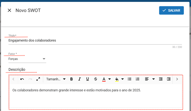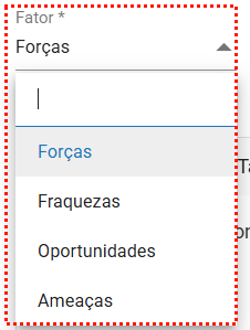 Fator(obrigatório): Nesse campo, você deve definir a qual categoria da matriz SWOT a informação pertence — Força, Fraqueza, Oportunidade ou Ameaça.
