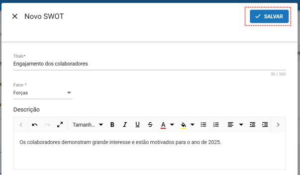 Descrição: Este campo não é obrigatório, mas é recomendável preenchê-lo. Nele, você pode detalhar de forma clara e objetiva o aspecto relacionado ao fator selecionado, facilitando a compreensão e a análise do seu planejamento estratégico.