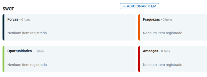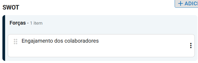 Seu SWOT foi criado com sucesso e ficará disponível na listagem. Ele também poderá ser vinculado à sua estratégia sempre que necessário.