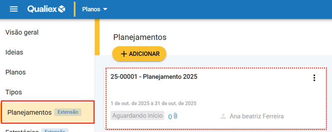 Ao acessar a aba Planejamentos, será exibida a lista dos planejamentos cadastrados no sistema. Para visualizar os detalhes do seu planejamento, basta clicar sobre ele.