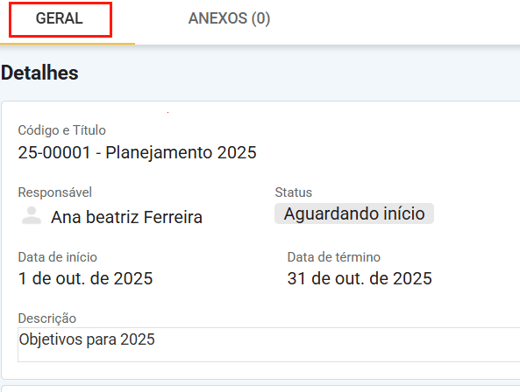 Após clicar sobre o planejamento ,será exibida a aba Geral, onde você poderá visualizar informações mais detalhadas do seu planejamento. Nessa mesma aba, também é possível cadastrar uma matriz SWOT vinculada ao planejamento.