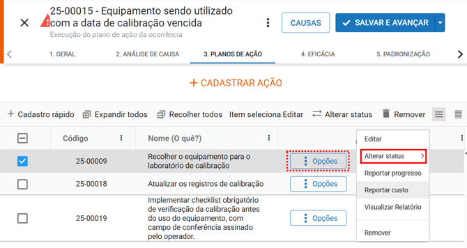 - Verificando eficácia (C): Com a execução concluída podemos verificar se a ação foi eficaz, defina o status como verificando eficácia para indicar que a ação está em verificação.