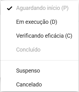 - Aguardando início (P): Status inicial, quando criamos uma ação vem definido como aguardando início.