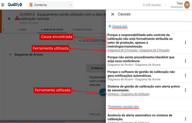 Na etapa de Análise de Causa, clique em "Causas" para visualizar as possíveis causa e causas raízes encontradas.