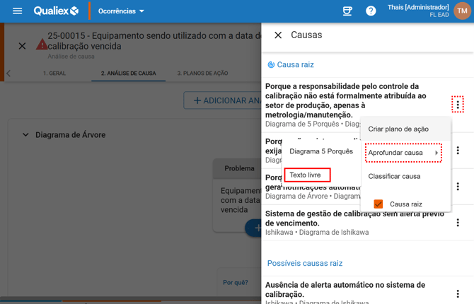 Como aprofundar a análise de causa de uma ocorrência utilizando texto livre no Qualiex?