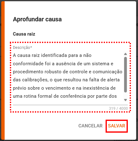 Na sequência será aberta a tela para descrever o aprofundamento da causa.
