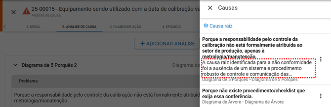 Na etapa de Análise de Causa, clique em "Causas" para visualizar as possíveis causa e causas raízes encontradas.