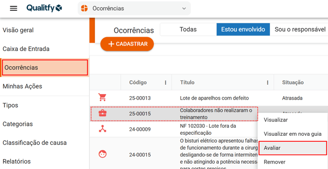 Ao clicar em Avaliar será aberta a ocorrência para avaliação das informações de cadastro e definição da tratativa.
