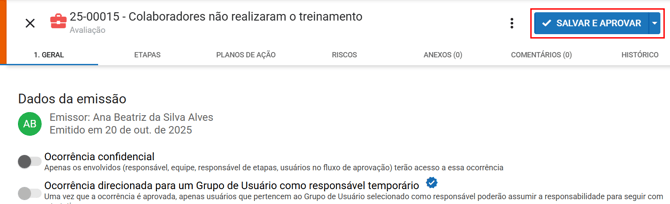 Ao concluir a avaliação e definições necessárias você deve aprovar a ocorrência para dar continuidade na tratativa.