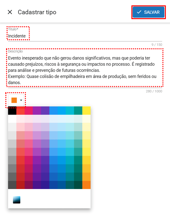 - Cor: Selecione uma cor para representar esse tipo (caso não escolha, ele irá na cor branca como padrão).