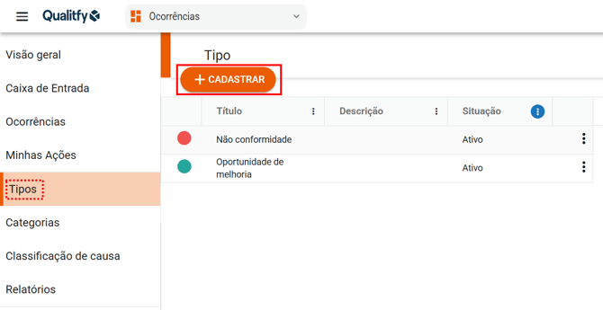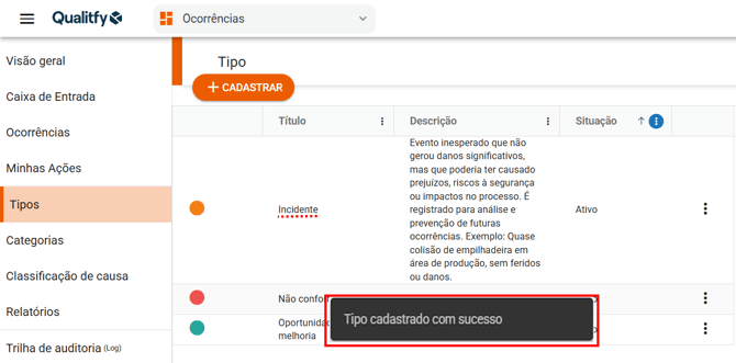 Como cadastrar um tipo de ocorrência no Qualitfy?