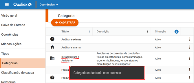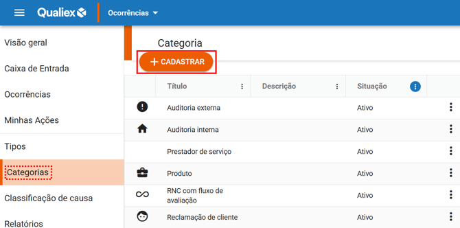 Como cadastrar uma categoria de ocorrência no Qualiex?