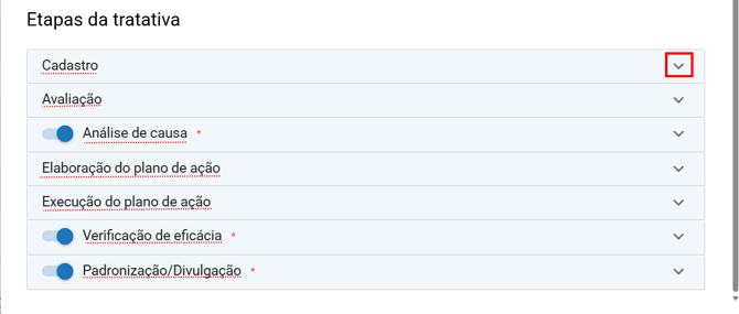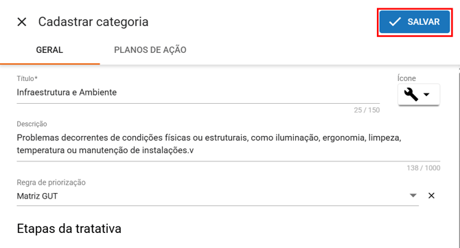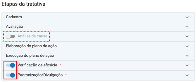 - Ativar ou desativar a etapa: para algumas categorias não há necessidade de passar por todo o ciclo do PDCA, por isso há a possibilidade de desativar as etapas Análise de Causa, Verificação de Eficácia, e Padronização/Divulgação.