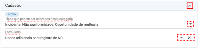 Para a etapa de Cadastro da ocorrência será possível definir quais tipos estão vinculados à categoria que está sendo cadastrada, e qual o formulário adicional poderá ser utilizado.