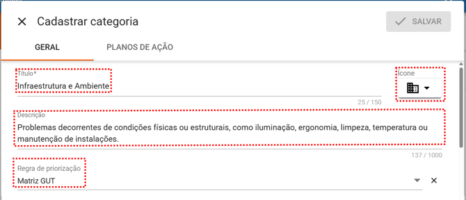 - Ícone (é opcional): Selecione um ícone para representar essa categoria, ele ajuda na identificação visual (caso não escolha, a categoria não terá ícone).