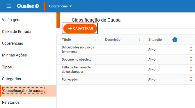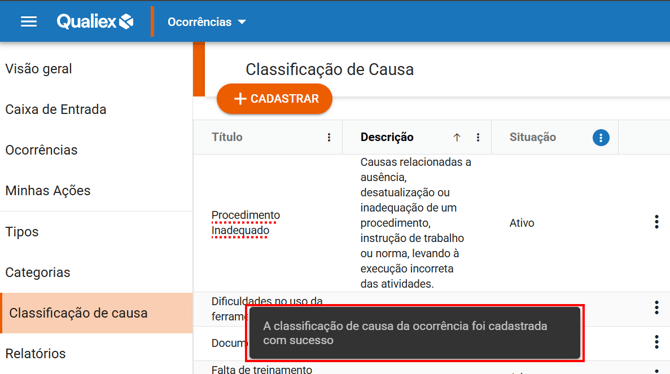 Como cadastrar uma Classificação de Causa no Ocorrências Qualiex?