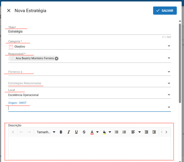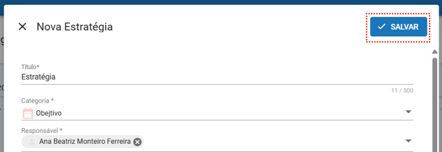 - Responsável (obrigatório): Pessoa que será responsável pela execução e acompanhamento da estratégia.
