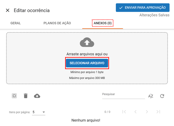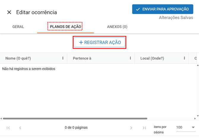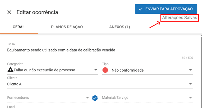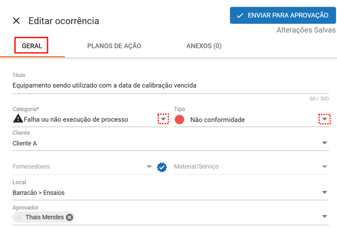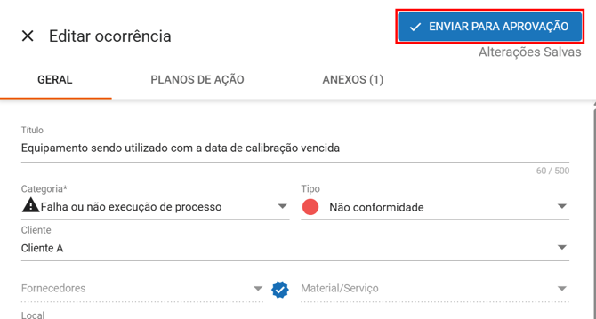 Ao preencher todas as informações necessárias será possível enviar a ocorrência para aprovação, onde o aprovador irá avaliar se deve seguir com a tratativa ou não. Para avançar para a próxima etapa clique em "Enviar para a aprovação".