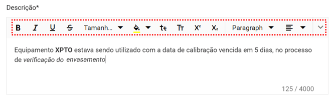 - Descrição: Descreva detalhadamente a situação que levou a criação dessa ocorrência. Utilize a barra de ferramentas para formatar o texto.