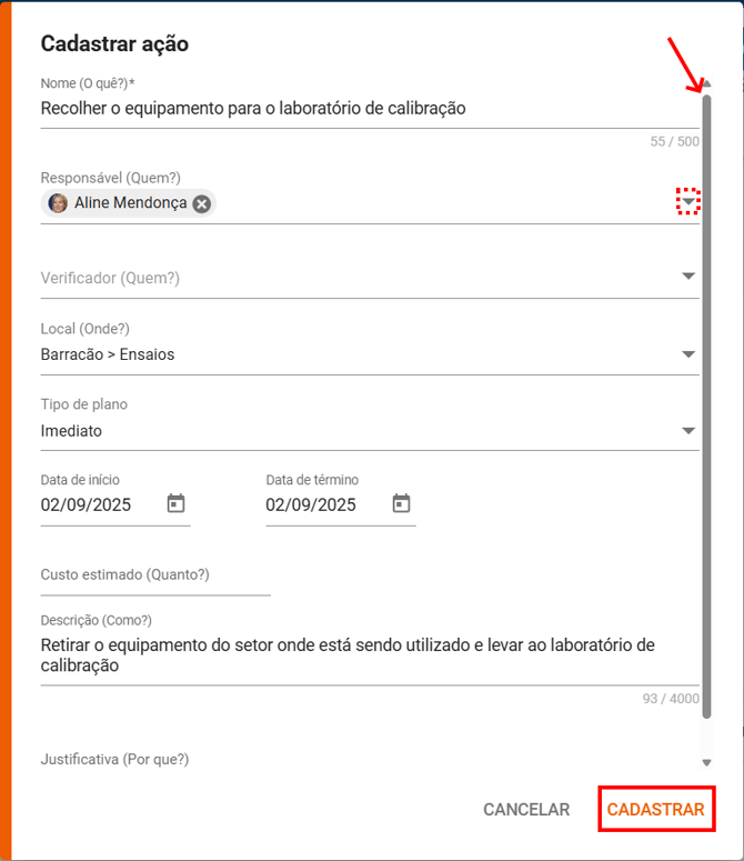 - Responsável (opcional): selecione o colaborador responsável pela execução da ação.