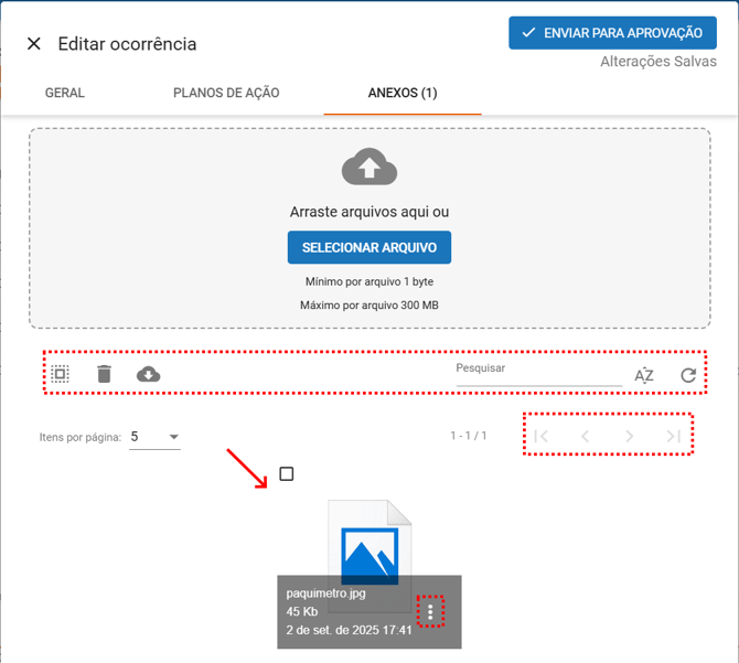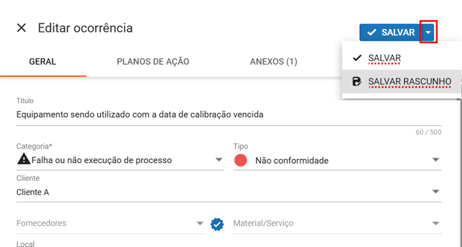 - Salvar rascunho: a ocorrência fica salva como rascunho e pode ser editada (quantas vezes for necessário) antes de ser enviada para aprovação.