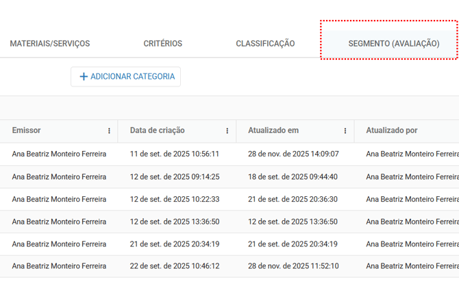 Para acessar a aba Segmento (avaliação) e realizar qualquer edição, é necessário possuir a permissão de “Gerenciar segmentos e avaliação”. Definido na aba Configurações > Papéis e permissões.