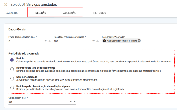Com a Periodicidade Avançada, você tem total controle sobre quando e como cada fornecedor será reavaliado.