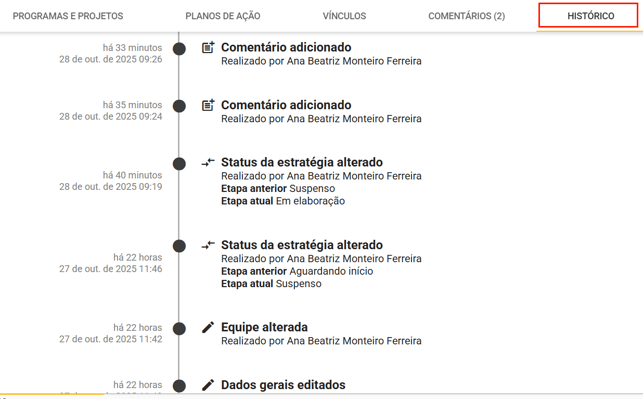 A consulta ao histórico de uma estratégia é uma funcionalidade essencial para garantir transparência e controle dentro do projeto. Por meio dela, é possível acompanhar todas as alterações realizadas, como mudanças de status, ajustes de metas, inclusão ou exclusão de ações e até quem realizou cada modificação.