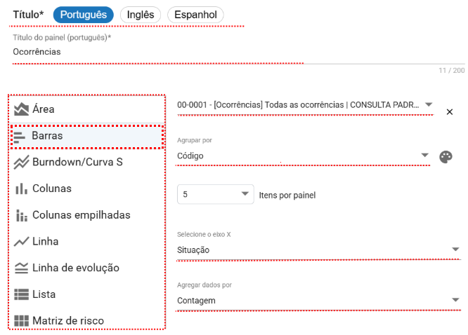 É possível inserir o título em Português, Inglês e Espanhol, garantindo que o painel seja exibido corretamente para usuários que utilizam outros idiomas no sistema.