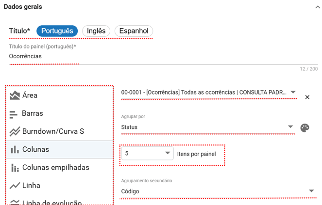 É possível inserir o título em Português, Inglês e Espanhol, garantindo que o painel seja exibido corretamente para usuários que utilizam outros idiomas no sistema.