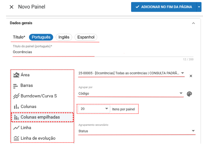 É possível inserir o título em Português, Inglês e Espanhol, garantindo que o painel seja exibido corretamente para usuários que utilizam outros idiomas no sistema.
