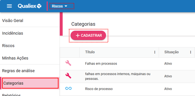 Para cadastrar uma nova categoria no módulo Riscos, primeiro acesse o módulo e, em seguida, vá até a aba “Categoria”. Dentro dessa aba, clique em “Cadastrar” para iniciar o processo de criação.
