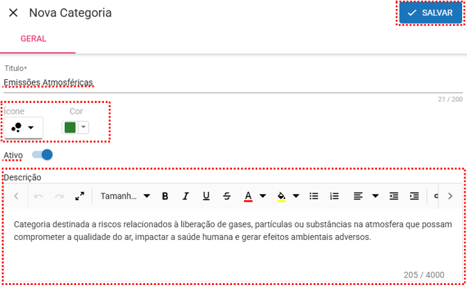 Ícone: Escolha um ícone que facilite a identificação visual da categoria. Ele deve estar relacionado ao tema do risco.