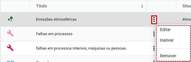 Editar: Permite alterar informações da categoria, como nome, ícone, cor, descrição ou status. As alterações são aplicadas automaticamente aos riscos que já utilizam essa categoria, garantindo atualização mesmo quando ela já está em uso.