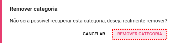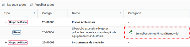 Remover: Exclui a categoria do sistema de forma definitiva. Ao selecionar essa opção, será exibida uma janela solicitando confirmação da remoção. Os riscos que estavam vinculados à categoria removida continuarão registrados, mas a aba de categoria exibirá a indicação “removida”.