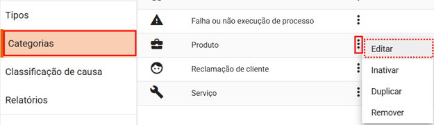 Acesse a aba Categorias no módulo Ocorrências. Dentro dessa aba, localize a categoria que deseja desvincular do tipo e clique sobre ela para abrir a tela de edição. Será exibida uma janela com todas as configurações da categoria.