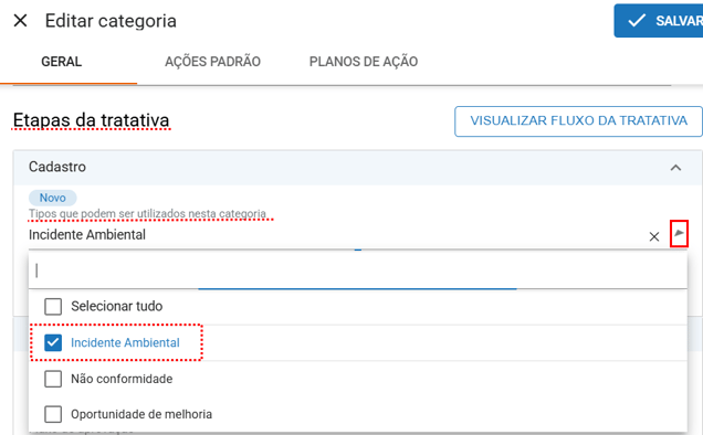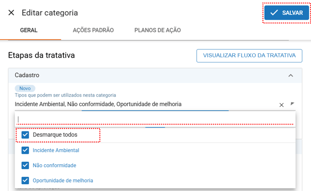 Na tela de edição, vá até o tópico “Etapas da tratativa”. Dentro da etapa Cadastro, procure pelo campo “Tipos que podem ser utilizados nesta categoria”. Clique para abrir a lista e desmarque a caixa correspondente ao tipo que deseja remover da categoria.