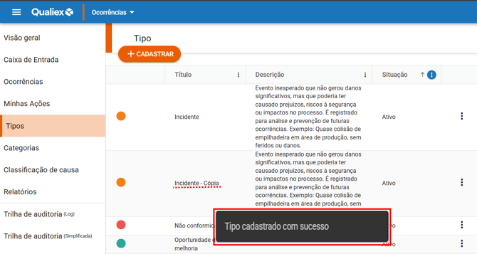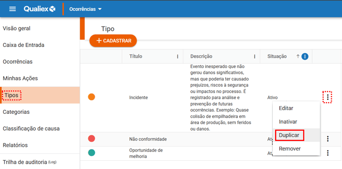 Como duplicar um tipo de Ocorrência no Qualiex?
