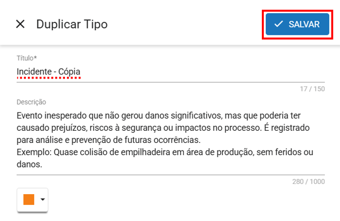 Ao selecionar a opção de "Duplicar", uma janela será aberta, permitindo realizar alterações na cópia. No título será adicionado a identificação de "- Cópia" em frente ao nome do tipo que já estava cadastrado.