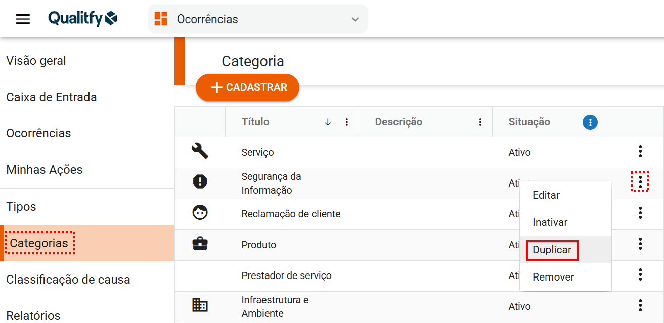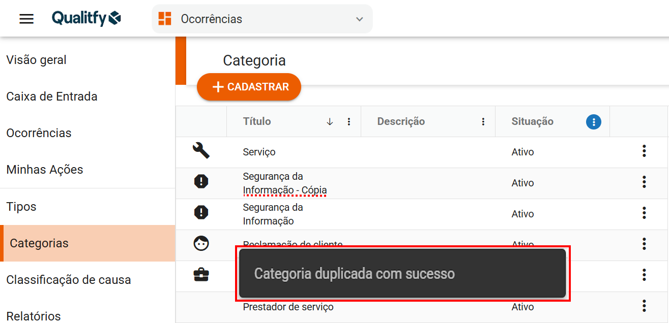 Como duplicar uma categoria de ocorrência no Qualitfy?