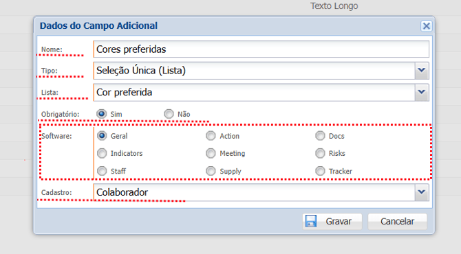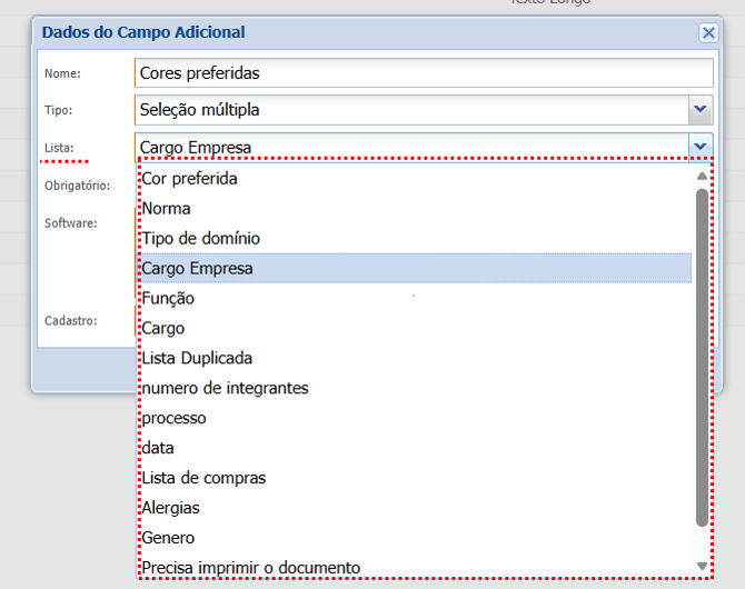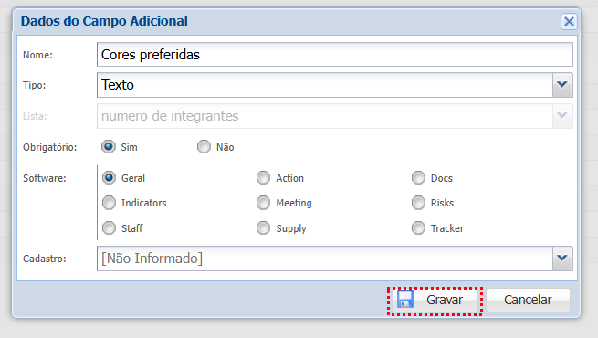 - Software: Selecione em qual módulo será exibido o campo adicional.