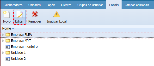 Na aba “Locais”, localize o local que deseja editar e clique no ícone