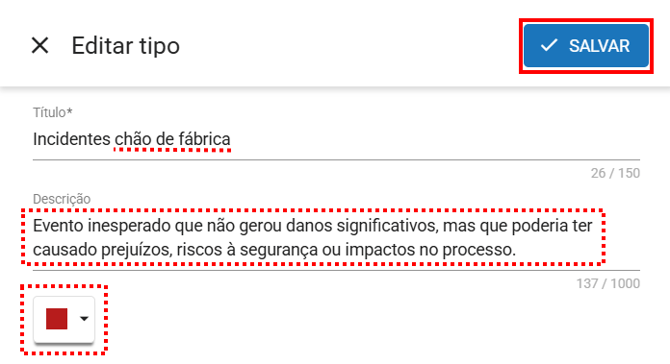 Ao selecionar a opção de "Editar", uma janela será aberta, permitindo realizar alterações no tipo.