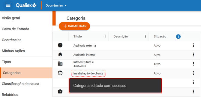 Ao editar uma categoria de ocorrência, todas as ocorrências vinculadas a ela também serão atualizadas para refletir as alterações feitas (incluindo concluídas e canceladas). Caso não queira essa atualização em todas as ocorrências utilize a opção "Duplicar". Clique aqui e saiba como duplicar a categoria.