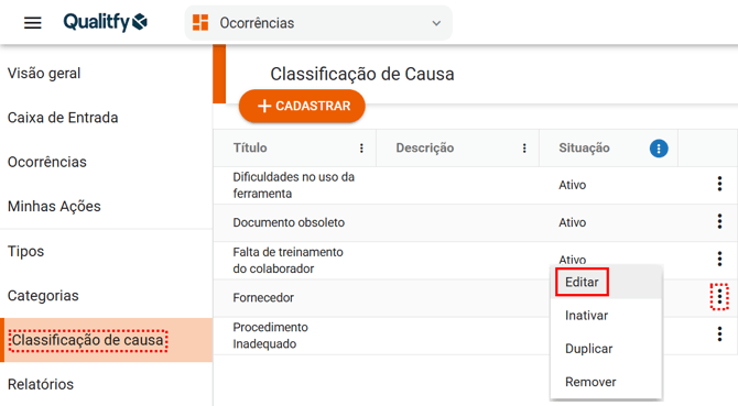 Para realizar a edição é necessário ter a permissão de Gerenciar tipos, categorias e classificações de causa, definido nas Configurações > Papel e Permissões. Clique aqui para saber como realizar a configuração para o módulo Ocorrências.